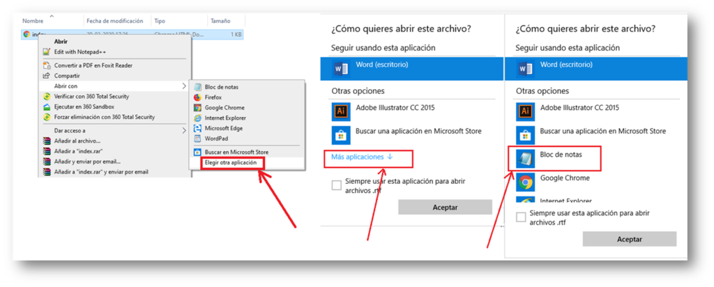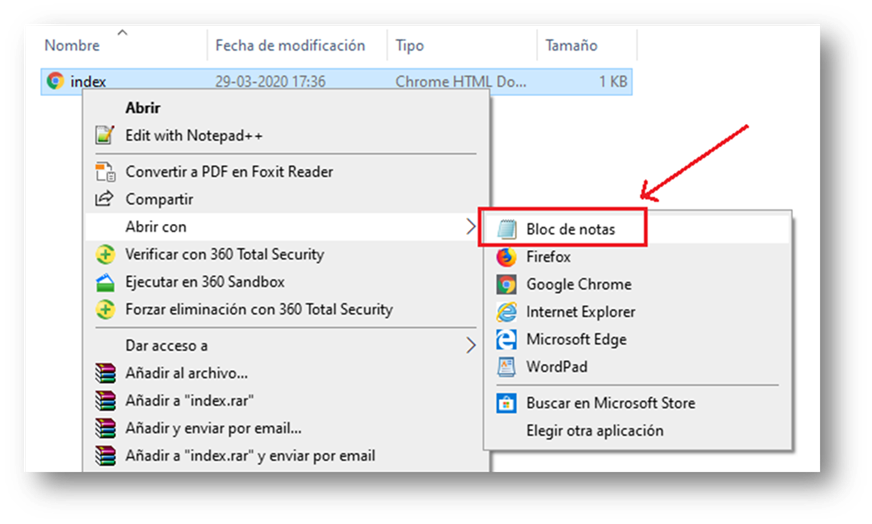 Al archivo le hacemos click derecho «Abrir con / Bloc de Notas»