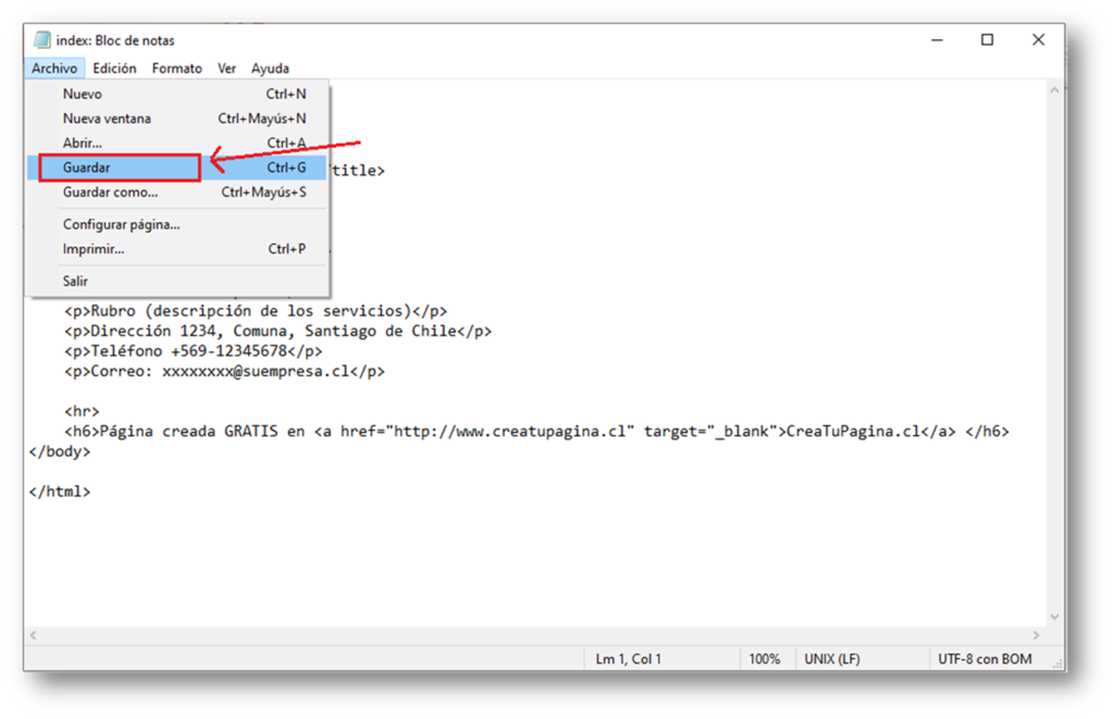 Si quieren ver como quedó el archivo «index.html», pueden hacerle click derecho «Abrir con / Chrome» (o con cualquier otro navegador).