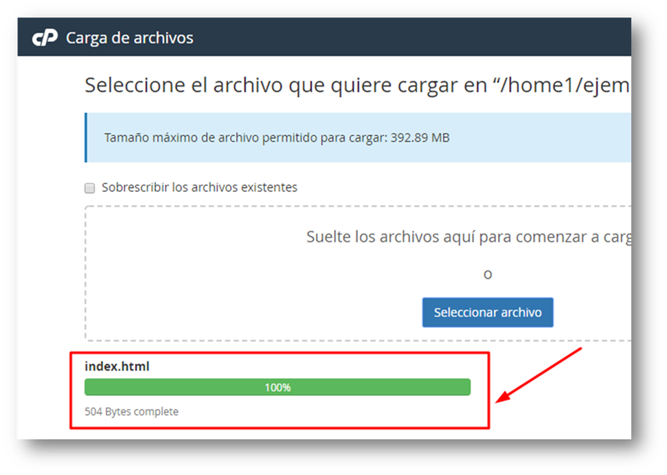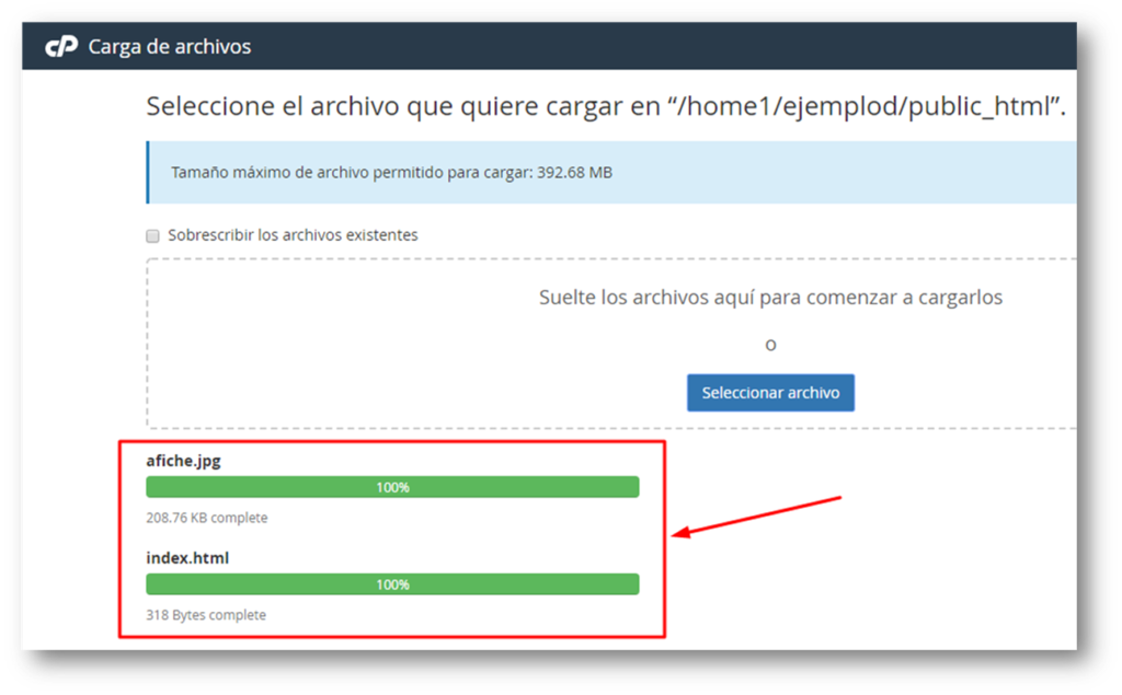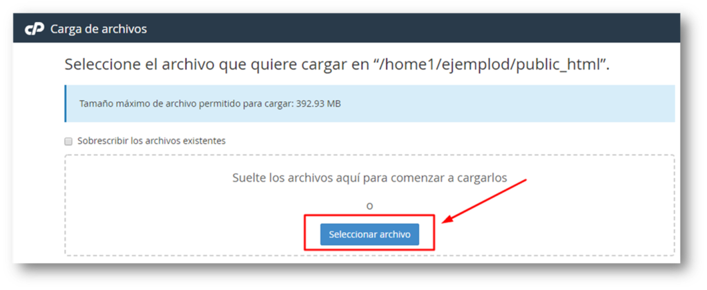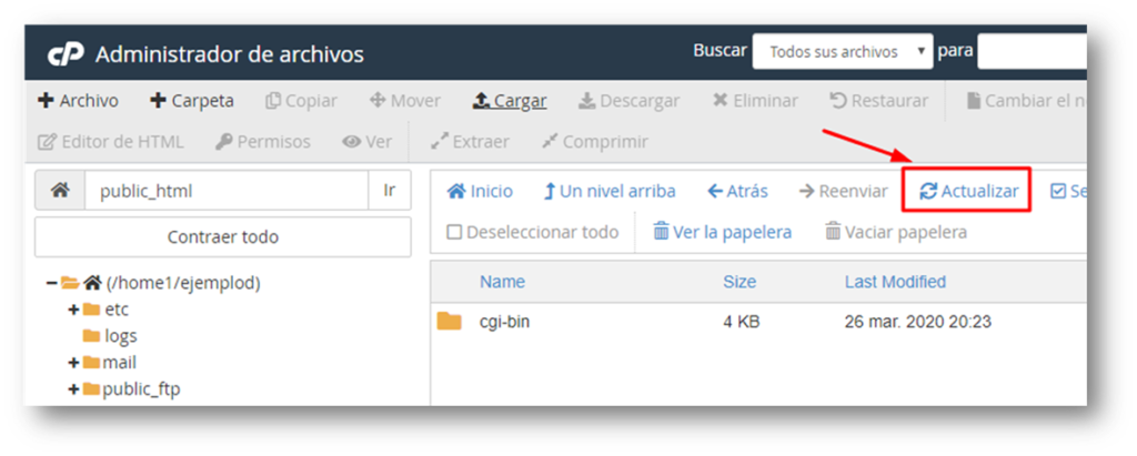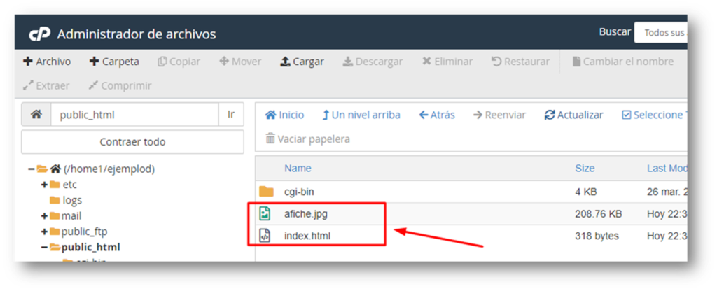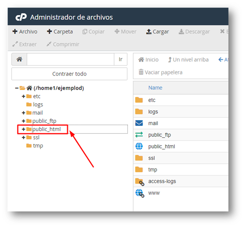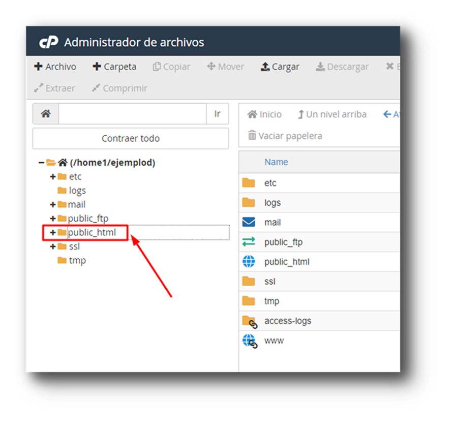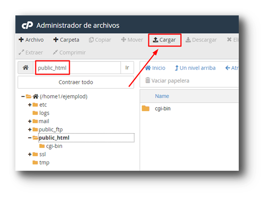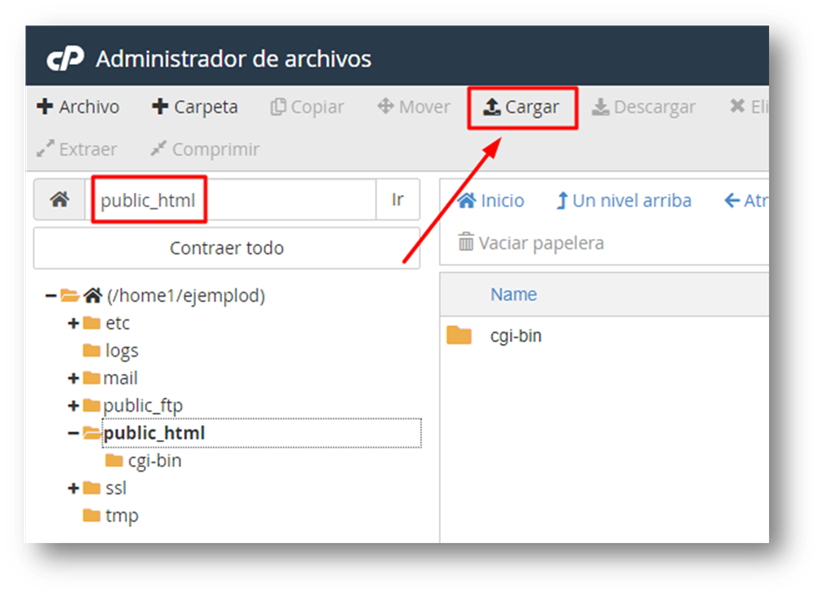 Y estando dentro de la carpeta «public_html» pinchamos botón «Cargar»